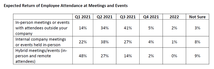• Three out of four respondents expect employees to attend in-person meetings/events in Q2 or Q3 2021, with 89% of respondents set to attend an in-person meeting or event with attendees outside their company by Q3 2021.