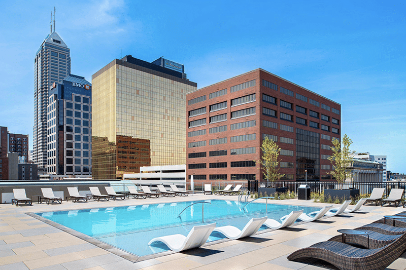 Site of the former iconic Market Square Arena, 360 Market Square has risen on the same hallowed ground to become a 28-story mixed-use development. Featuring 292 luxury studio, one and two-bedroom apartments, 360 Market Square includes a 40,000 square foot Whole Foods Market™, an additional 2,500 square foot Starbucks™, and a 525-space parking garage. The most stunning luxury apartments in downtown Indianapolis feature floor-to-ceiling glass, balconies with an amazing array of city views, wood-style flooring, stainless steel appliances, and quartz countertops. Residential amenities include a resort-style pool with sundeck, state-of-the-art fitness center, and breathtaking courtyards.